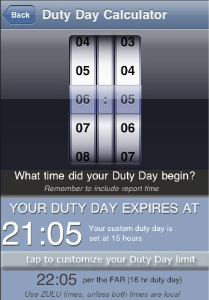 Simply set the dials to match the start of your "Duty Day" and you will immediately see the time that your next rest period must begin. You can even customize the length of your Duty Day, if your Contract or Company Policy is more limiting than the 16 hr Duty Day that the FAR specifies.