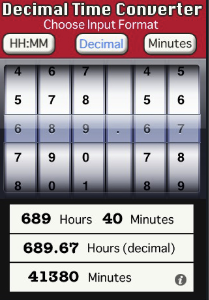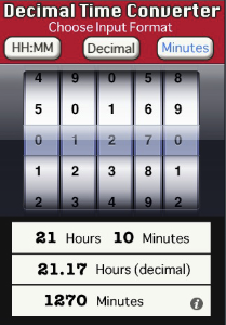 Input values can be entered as hours:minutes, decimals, or just minutes, by selecting the input mode at the top of the screen. All conversions are displayed instantly in the lower half of the screen.