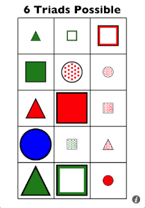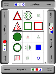 The goal of this game is to find triads. Each card has four attributes (size, color, shape, and pattern). Each attribute has three possible states.