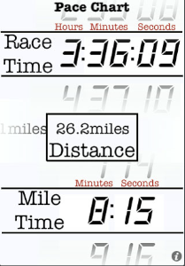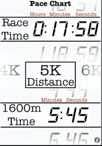 Pace Chart is an iOS application that is used to calculate mile paces for runners. To calculate the necessary mile pace for a race, first drag the distance slider to the desired distance. Next, specify a race time by dragging the hours, minutes and seconds sliders to the appropriate values.